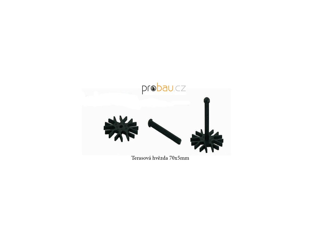 Terasové hvězdy jsou praktickým montážním prvkem používaným při instalaci dřevěných teras. Umisťují se mezi terasové prkno a nosný hranol, kde vytvářejí mezeru přibližně 5 mm, která umožňuje lepší odvětrání konstrukce a snižuje zadržování vlhkosti. Díky tomu pomáhají prodloužit životnost dřevěné terasy.